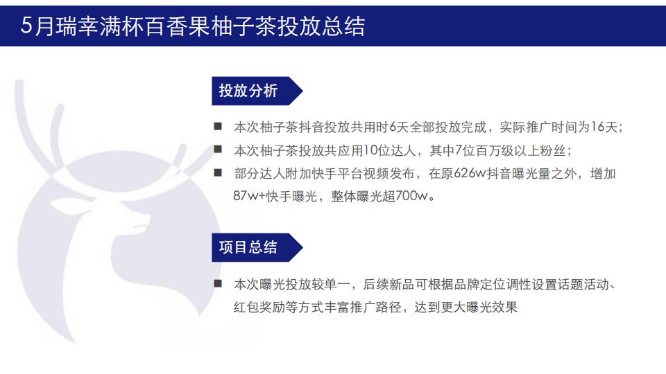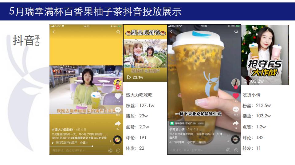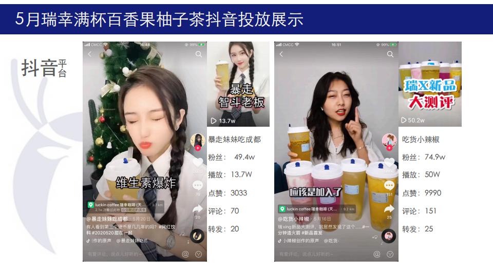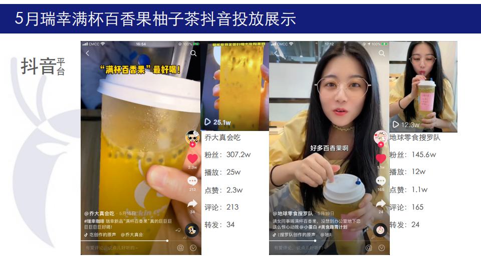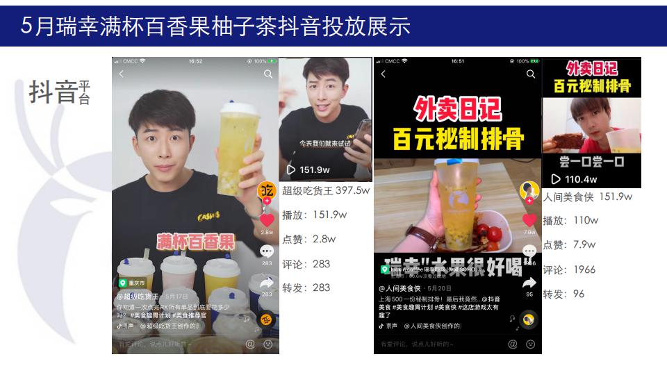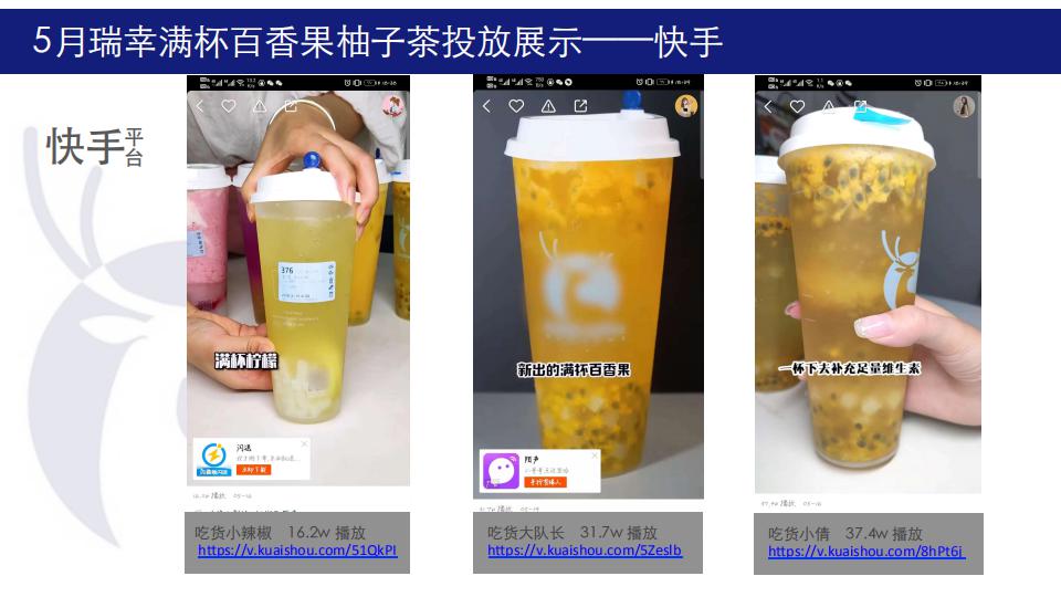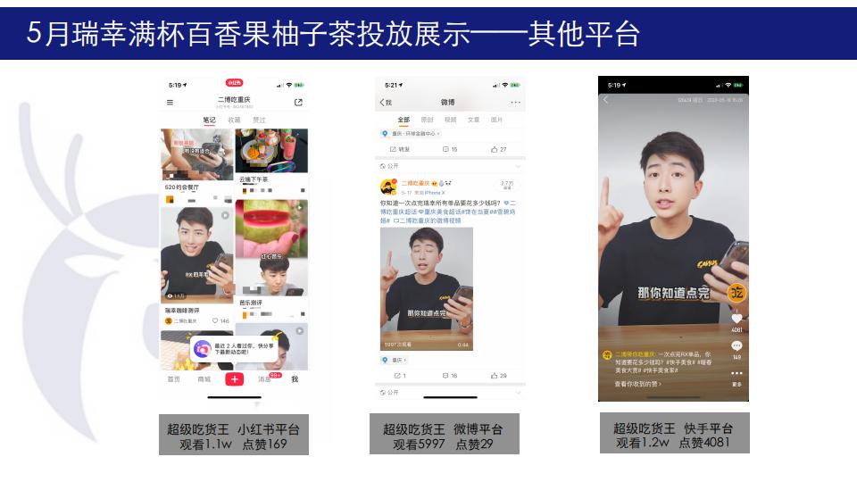 5月初夏利用柚子茶做新品集中推广,10位百万级达人5天集体引爆式投放曝光,在原626w抖音曝光量之外,增加87w+快手曝光,整体曝光超700w,结合品牌主推目标受众集中地区,投放地区以北上广深川渝为主,符合品牌人群定位。